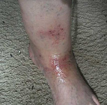 August 2007. She went off the water and her legs have been slowly clearing up. The one not so bad is completely healed but there is scarring and the pigment is darker. The other one is almost healed up. She took a shower 2 weeks ago because she was desperate to get clean -- and she paid - both legs got bad again. She drinks and cooks with bottled spring water and her son, who works where there is no chloramine, keeps her in water from there to bathe with.