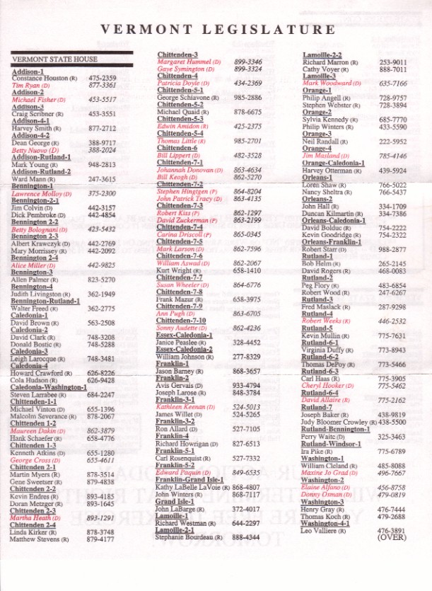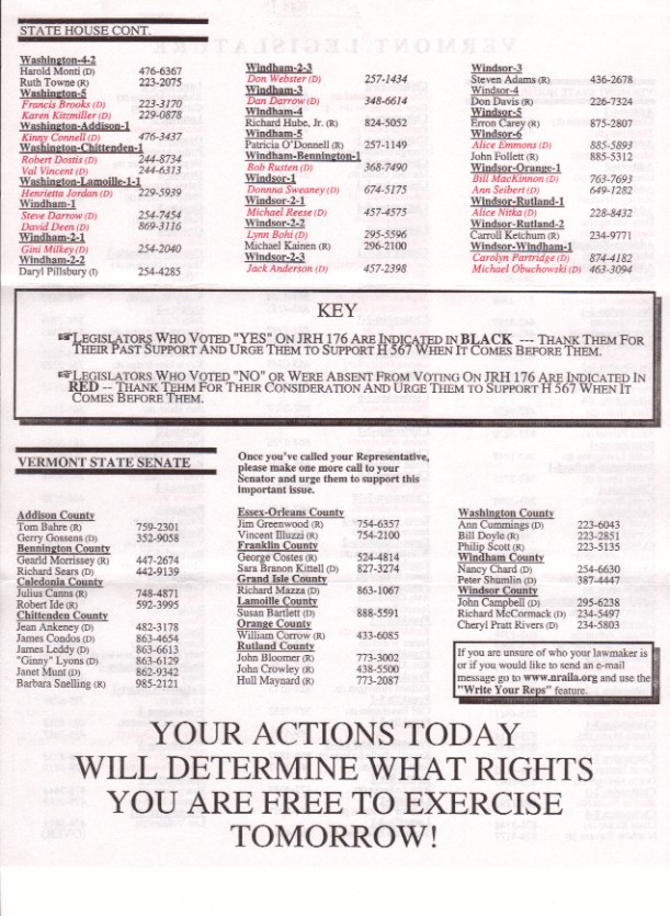 Please see the enclosed slate to locate your representative and determine how they voted on JRH 176. If your representative voted yes, please call him or her and offer your appreciation for their past support and urge them to vote "yes" on H 567. If your representative did not support the resolution (or was absent), please contact him or her to thank them for their consideration and ask that they vote "yes" on H 567. Eighty -nine house members, lead by Speaker Walter Freed, voted for this resolution and came through for sportsmen and women in a big way! That is why it is imperative that we call today to acknowledge their efforts and encourage all members of the legislature to keep the Vermont traditions alive!